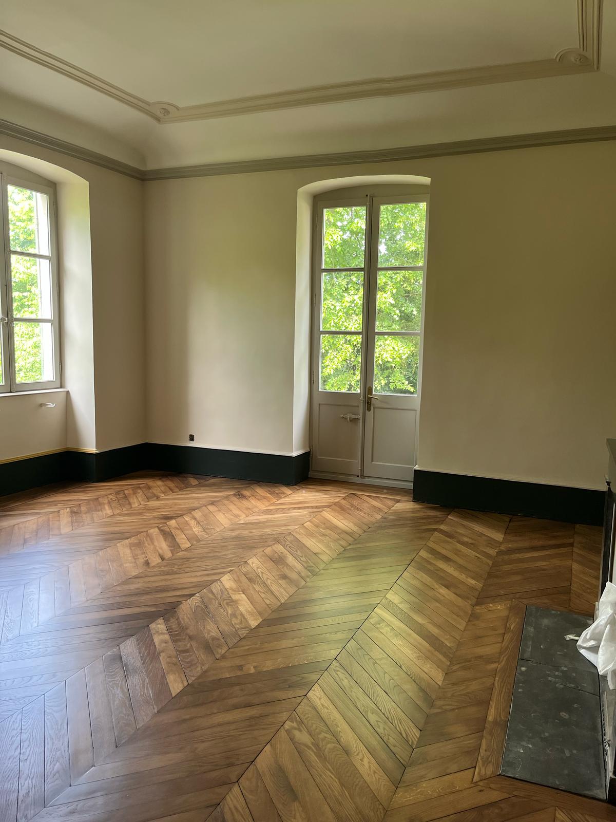 Niche décorative sur mesure avec papier peint art déco et finitions bois et vert céladon