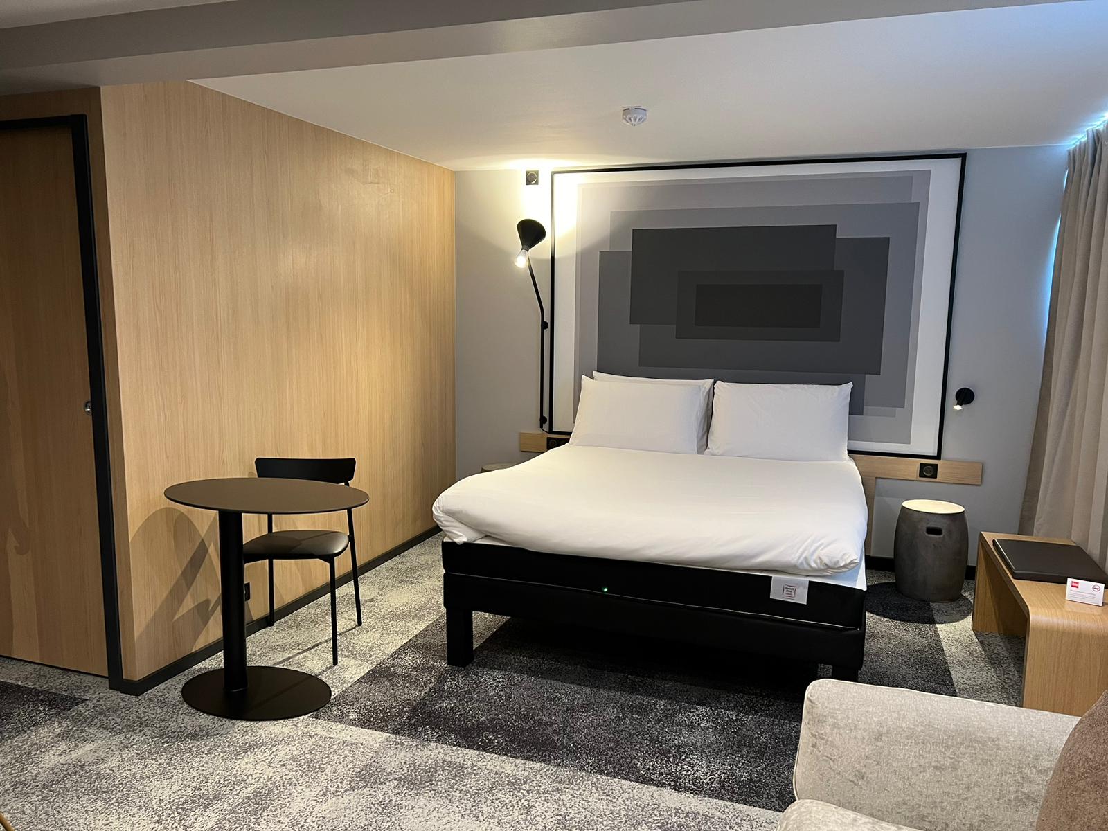 Salle de bain épurée avec meuble en chêne, vasques noires et robinetterie murale mate