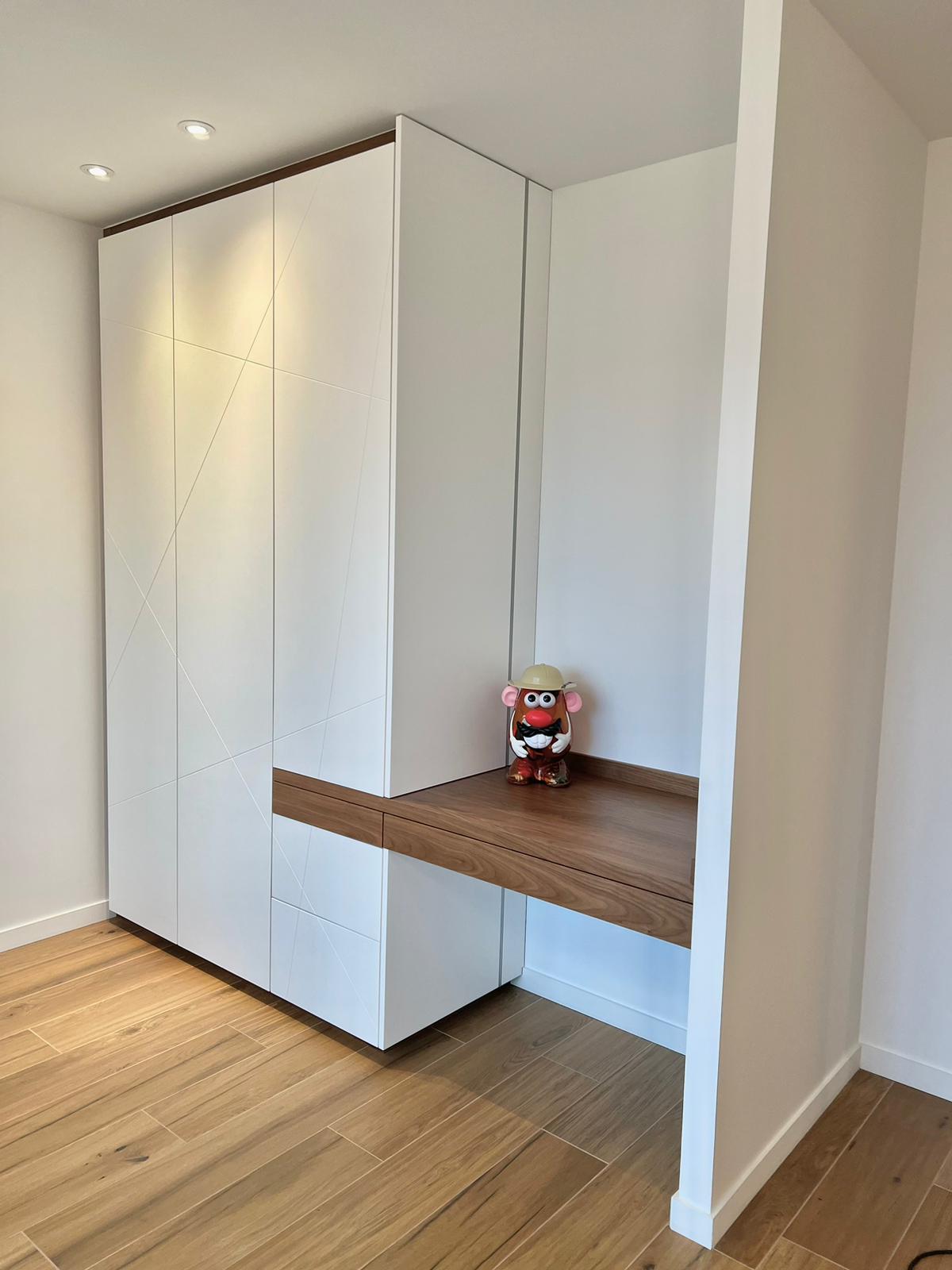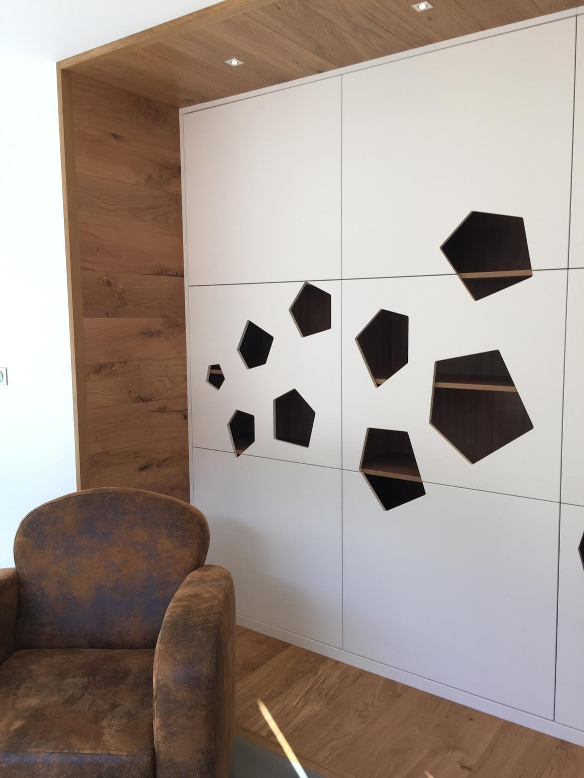 Placard graphique avec niches polygonales découpés et finitions bois clair et blanc mat